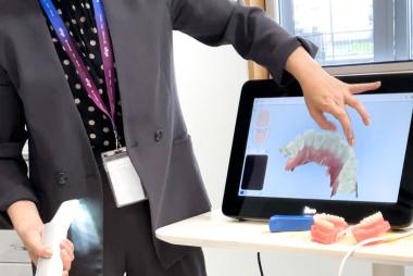 今月のミーティングでは、お口の中を立体的に捉えることができる『口腔内スキャナー』の講習を受けました。お口の中を3Dの立体画像で見ることができます。また、スキャンによる型取りは、データを送ることで補綴物などを作成することも可能ということでした。